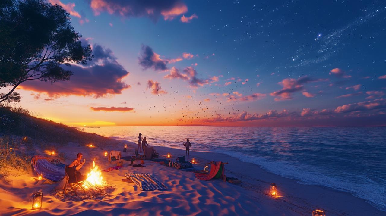 Para eventos nocturnos o momentos más relajados de la jornada, las experiencias contemplativas ofrecen un contraste perfecto con las actividades físicas. Organizar una sesión de cine bajo las estrellas crea un ambiente mágico e íntimo: instala un proyector portátil y una pantalla blanca o simplemente utiliza una pared cercana si la playa cuenta con construcciones apropiadas. Selecciona películas que complementen la temática de tu evento, ya sean clásicos del cine de verano, comedias románticas ambientadas en la costa o documentales sobre la vida marina. Proporciona mantas y cojines para que los asistentes se acomoden confortablemente en la arena mientras disfrutan del espectáculo. La música en vivo eleva cualquier celebración a un nivel superior: desde un guitarrista acústico que interprete canciones populares hasta una pequeña banda de reggae que haga bailar a todos en la arena, las opciones se adaptan a diferentes presupuestos y estilos. La música en vivo crea una atmósfera especial que las listas de reproducción pregrabadas simplemente no pueden igualar. Si el presupuesto lo permite, contratar un DJ profesional garantiza que la música fluya sin interrupciones y que el ambiente se mantenga vibrante durante toda la celebración. Las sesiones de yoga al atardecer o prácticas de mindfulness frente al mar ofrecen experiencias de bienestar que tus invitados recordarán mucho después del evento. Estas actividades funcionan particularmente bien en contextos corporativos, donde la desconexión digital y la reconexi\u00f3n con el entorno natural aportan beneficios tangibles para el bienestar de los equipos. Los fuegos artificiales, donde estén permitidos y con los permisos correspondientes, proporcionan un cierre espectacular para tu evento, dejando a todos con una imagen imborrable de la celebración.